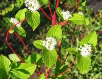 Высотой более 2 м. Цветение в начале лета. Цветки мелкие, белые.  Кустарник с зелеными листьями и ярко-красными стволами. Цветки в щитковидных соцветиях. Ягоды белые с синеватым оттенком, не съедобные. Осенью листья окрашиваются в красно-бурые тона. Пригоден для живой изгороди, устойчив к болезням.