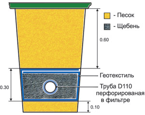 - Затем в траншею насыпают гравий или щебень, и вновь идет геотекстиль.